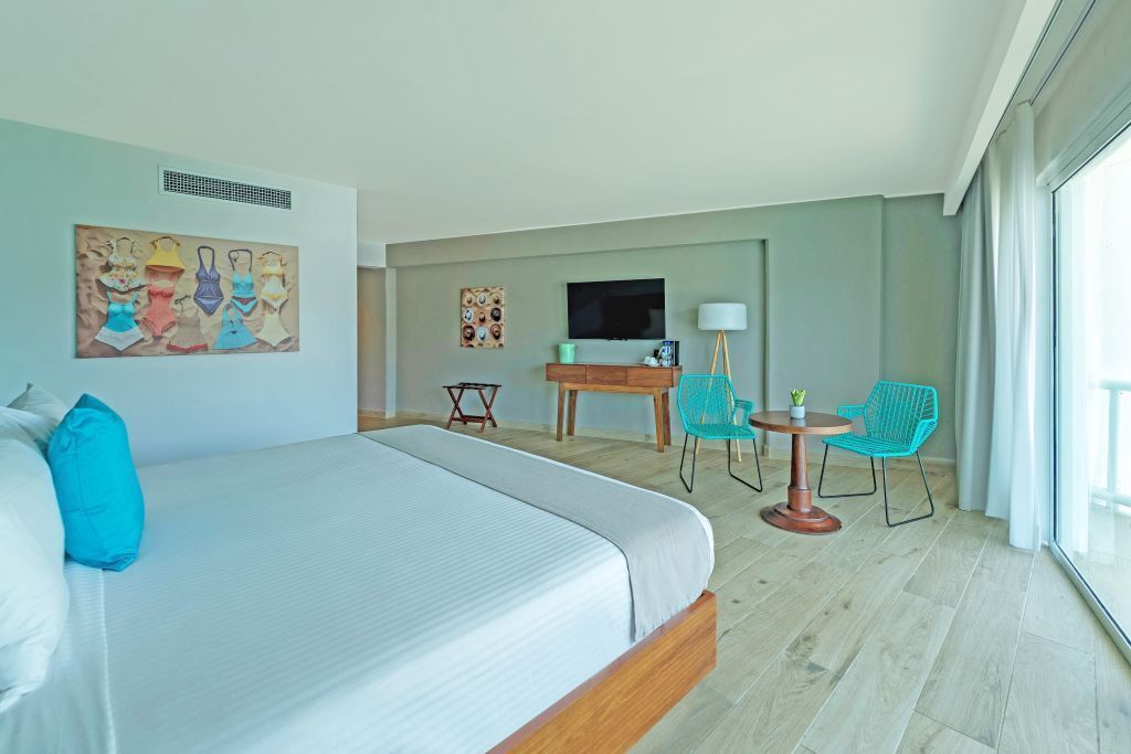 Disfruta de una estancia relajante en una habitación amplia y luminosa con balcón privado y vista parcial al mar, ideal para disfrutar la brisa marina. Su diseño vintage, combinado con detalles en madera dan personalidad al espacio, mientras que la cama King te ofrece el confort ideal para un descanso profundo.